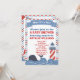 Este convite bonito tem muitos elementos divertidos, começando com a borda do chevron em vermelho, azul, cinza e branco.  Uma faixa azul de fita diz Ahoy!É um rapaz! com uma âncora em cada lado.  Uma baleia natação as águas do oceano enquanto um farol vermelho e branco listra à distância.  Personalize este convite com os detalhes do seu chá de fraldas.  O verso tem bastante espaço para informações de registro e outros detalhes.  Também tem outros elementos náuticos como veleiro, salva-vidas e bunting.  Este convite divertido é perfeito para uma festa de chá de fraldas de tema náutico.
