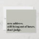 Neste cartão irônico, uma fonte ousada foi usada para renderizar "novo endereço. ainda vivendo de caixas. não julgue." na frente. Detalhes atualizados, juntamente com um amigável "Keep in Touch!" aparecem no verso. Todas as fontes, cores e texto podem ser alterados de acordo com suas próprias necessidades.