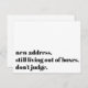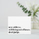 Neste cartão irônico, uma fonte ousada foi usada para renderizar "novo endereço. ainda vivendo de caixas. não julgue." na frente. Detalhes atualizados, juntamente com um amigável "Keep in Touch!" aparecem no verso. Todas as fontes, cores e texto podem ser alterados de acordo com suas próprias necessidades.