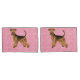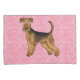 A ilustração original do desenho de Destei de um adorável cão da raça Airedale Terrier em uma cor de fundo rosa com um padrão de formas de coração.