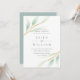 O convite de casamento botânico moderno em puro pastel d'água apresenta folhagem verde nas esquinas, enquadrando seus detalhes de casamento em uma elegante letra de cinza média.