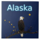 Uma águia americana examina o céu do seu poleiro em um galho de árvore; sobreposta a uma bandeira do Alasca. O texto que diz "Alasca" também aparece em azul e branco brilhante.