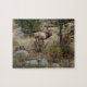 Este alce do touro parece impermeável aos espectadores no parque nacional de montanha rochosa. Trabalhe o quebra-cabeça. Pendure-o então em sua parede.