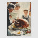 Esta imagem retrata uma cena clássica de Ação de Graças reminiscente de ilustrações vintage. Ela apresenta uma família reunida em torno de uma mesa de jantar, observando alegremente enquanto um homem mais velho trincha um grande peru assado dourado. A luz quente que entra pela janela ilumina os rostos dos membros da família, destacando sua felicidade e expectativa. A mesa está elegantemente posta com um banquete farto, incluindo uvas e guarnições decorativas ao redor do peru. A atmosfera geral evoca uma sensação de nostalgia, calor e celebração.