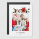 Design de Natal brilhante, moderno e limpo, com modelo fotográfico, campos de texto editáveis e texto ousado "Joy" embelezado com vibrantes poinsetos vermelhos e verdes, bagas e verde de inverno.