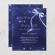 Um fundo azul marinho, decorado com brilho azul e um arco. A cor azul é irregular. Personalize e adicione um nome e detalhes da parte. Texto: Algo azul antes de mim. 1 folha = 1 chá de panela impresso borda a borda.