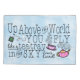 As citações neste design bonito, lunático para o leitor ávido vêm de um poema de Lewis Carroll em seu livro, "Alice no país das maravilhas." O Hatter louco relata-as no tea party: Acima acima do mundo você voa/como uma chá-bandeja no céu. As características de design extravagantes da tipografia um teacup, um bule/chaleira e um saquinho de chá, terminam com vapor de roda - toda flutuando em uma luz - fundo azul do céu nebuloso.