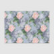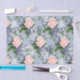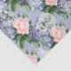 O Chapéu Louco, o Gato Cheshire, a menina Alice e o Coelho Branco do livro clássico Alice no País das Maravilhas aparecem em branco escondendo-se entre as folhas e as flores dos belos rosas azuis azuis, rosa e azul-claro, neste adorável papel de tecidos literários brancos para embalagem de presente ou desenho e desvinculação..