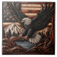 Um esculpimento detalhado de alivios apresenta uma águia feroz contra o fundo de uma bandeira americana, cercada por montanhas e água fluindo, mostrando intrincada artesanato.