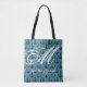 A stylish teal tote bag with your name and initials on a pattern background of blue anchors