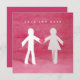Anúncio personalizável de Salve a Data para casamento / convite com figuras de papel recortadas - menino e menina fofos de mãos dadas e coração em fundo rosa.