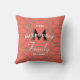 Travesseiro decorativo coral vivo à moda da decoração do monograma da família da cor com redemoinhos escuros da cerceta e tipografia corajosa branca e preta. Apenas use "personalizam a característica deste modelo" para introduzir seus nome de família, inicial e data estabelecida.