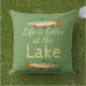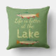 A " vida é melhor o lago" é imprimida na tinta amarela em uma máscara de relaxamento do verde de musgo. Duas imagens coloridas da truta, uma que enfrenta à esquerda, uma que enfrenta certo vestem acima o design do travesseiro.