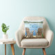 Na frente estão as palavras "A vida é melhor no lago" em texto azul correspondente no impressão da pintura original de aquarela de duas cadeiras Adirondack numa doca com vista para um lago azul calmo. O verso é apenas o trabalho de arte com o texto.