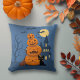 Gato preto bonito e vassoura-bruxa perto de uma pilha de abóboras rindo que estão caindo. Uma árvore morto, uma mansão assustadora, alguns morcegos, e a lua são vistos no fundo.
