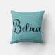 A pia batismal escrita mão no preto com a palavra "acredita" em um travesseiro decorativo do azul do ovo do pisco de peito vermelho. Outros tamanhos do travesseiro estão igualmente disponíveis. Design pela vida da casa da quinta.
