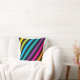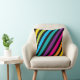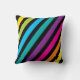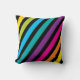 Esta almofada quadrada apresenta um padrão estriado diagonal vibrante numa gama de cores, incluindo amarelo, azul, verde, cor-de-rosa e cor de laranja contra fundo preto. O design e o tecido suave em negrito fazem dele um na moda e acessório confortável. Perfeito para adicionar um pop de cor e um toque moderno a qualquer sala.
