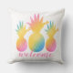 Uma almofada externa tropical com três abacaxis coloridos em gradiente de arco-íris e Boas-Vindas em letras rosa sobre um fundo branco. Os vibrantes abacaxis rosa, amarelo, azul-turquesa e coral trazem energia alegre e acolhedora para móveis de pátio, assentos de varanda ou cadeiras à beira da piscina. Um acessório divertido de verão para qualquer espaço de entretenimento ao ar livre.