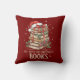 This whimsical and cozy design features a tall stack of vintage books wrapped in a festive red ribbon and topped with a classic Santa hat. The stack is adorned with twinkling Christmas lights and sprigs of holly and berries, all set against a snowy, sparkling background.