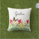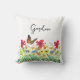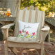 Destaque a decoração do seu espaço ao ar livre com este bonito travesseiro decorativo floral. Este travesseiro ao ar livre protegido por condições meteorológicas apresenta uma ilustração de papoilas vermelhas, flores pretas de Susan de olhos negros e flores azuis do botão do solteiro. Há também verde e borboleta. As flores coloridas são mostradas sobre um fundo branco cremoso. Personalize o texto deste travesseiro com suas próprias palavras ou comprar, como mostrado com "jardim" em uma fonte de script.
