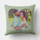 Design moderno e elegante de almofada personalizada apresenta uma foto favorita em um grande coração com uma sobreposição de design de tipografia minimalista branca "Amor" que inclui floreios e detalhes de coração. A cor de fundo verde laurel pode ser modificada. Uma ideia de presente único para um casal recém-casado ou para o seu amor no Dia dos Namorados!