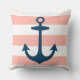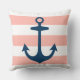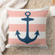 design na moda e travesseiro de sotaque quadrado chic apresentam um padrão listrado de cabana cor-de-rosa branca e esfregando coral com âncora azul marinho do barco. A cor de fundo cor-de-rosa-claro/coral-claro pode ser personalizada.