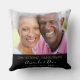 Uma almofada como presente, celebrando 25 anos de casamento. Um fundo preto moderno e elegante. Personalize e adicione sua própria foto de alta qualidade do casal feliz. O texto: Os nomes são escritos com uma fonte manuscrita moderna branca. Modelos para nomes e uma data.