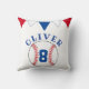 Travesseiro decorativo de Aniversário de criança de Ball Bunting Ball. O design tem bandeiras de baseball e bunting em cores vermelha, branca e azul. Adicione seu nome e sua idade.
