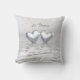 Almofada com a minha obra de arte de computador prateada de dois corações prateados flutuando na água. O texto personalizável diz "25 Anos".