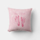 Um travesseiro do anúncio do nascimento do bebé com pegadas cor-de-rosa bonitos contra um fundo cor-de-rosa feminino macio. Personalize adicionando o nome do seu bebé ao texto customizável que diz: Bebé.
