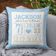 Travesseiro de anúncio de nascimento de menino azul e branco com bolinhas adoravelmente fofo com um coraçãozinho azul bebê doce. Edite para incluir todos os detalhes do nascimento do seu precioso bebê.