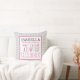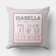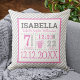 Travesseiro de anúncio de nascimento de menina adoravelmente fofo com listras rosa e cinza e um doce elefante bebê rosa. Edite para incluir todos os detalhes do nascimento do seu precioso bebê.