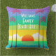 Decorre sua piscina ou pátio com este travesseiro personalizado divertido da casa de praia apresentando um pôr do sol colorido com o céu arco-íris, palmeiras estilizadas com estilo Deco e qualquer nome para fazer dele seu! Púrpura, aqua, turquesa, limão e amarelo adicionam um salto suculento ao seu decor tropical de Verão.