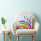 Bonita, colorida, travesseiro decorativo de menina feita em azul claro e claro, com gráficos de desenho de um unicórnio voador roxo em um arco-íris. Personalize para adicionar seu próprio texto.
