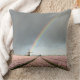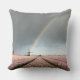 O coxim do travesseiro decorativo da foto com um arco-íris e as nuvens escuras durante um primavera atacam sobre uma paisagem com um moinho de vento velho e umas flores cor-de-rosa do jacinto na região holandesa do bulbo nos Países Baixos.