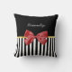Um elegante travesseiro decorativo quadrado com listras verticais pretas e brancas, embelezado com uma faixa colorida FAUX chic e uma imagem de um arco clássico do estilo fita vermelha. Personalize-o adicionando o nome daquela garota especial na sua vida. Imagem plana, NÃO metálica ou arco real.