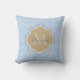 Um na moda azul-claro, deco, padrão de peixes da escala de peixes, travesseiro decorativo quadrado com um crachá quatrefoil bronzeado que você pode personalizar adicionando facilmente seu monograma e nome. Isto é parte da coleção de Primavera de Monograma de Pequeno Garoto Azul Escala de Peixe Aquecido.