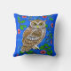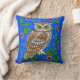Travesseiro de Art Nouveau inspira ilustração de uma coruja castanha e creme num fundo floral azul cobalto e laranja coral