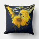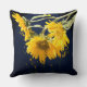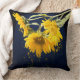 Três girassóis florescentes pendurados com a cabeça para baixo com um toque artístico das pétalas amarelas que pingam até o chão sobre fundo preto e efeito arco azul escuro