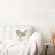 Almofada decorada com uma ilustração colorida de um galo. Um lado tem uma única impressão grande do galo, o outro lado é decorado com a mesma arte como um padrão.