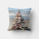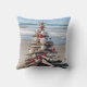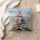 Árvore de natal de marisco com conchas e ornamentos de estrelas-do-mar em uma praia oceânica.