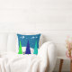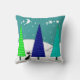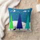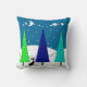 As árvores de Natal retros e o travesseiro do gato descansam, três árvores retros artísticas nas máscaras da cerceta e azul em uma cerceta mais escura e em um fundo azul. Árvores esboçadas com colinas nevado e o gato preto. Para trás do travesseiro em cores de coordenação mas em fundo é cor azul/verde mais clara.