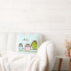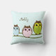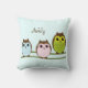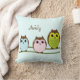 Travesseiro bonito feito em uma luz - fundo azul do acento do quarto da criança. Os gráficos dos desenhos animados um azul e marrom, de um cor-de-rosa e de um marrom e uma coruja verde e marrom que senta-se em ramos verdes decoram a parte dianteira e a parte traseira do travesseiro. Personalize o texto marrom lunático para sua sala de criança.