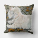 Sazonal Fall Autumn West Highland White Terrier deitado em um pátio de pedra com folhas caídas. Cachorro ocidental a espreitar por um arbusto florescente. Isobel. Copyright © 2025 Angi Laframboise. Todos os direitos reservados. Dons de cães de arte para amantes de cães.