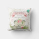 Um adorável elefante bebê com rosas cor-de-rosa na cabeça destaca este travesseiro de manutenção acolhendo uma menina. Incluir o nome do bebê, a data de nascimento, o dia da semana, o peso e o comprimento de um travesseiro personalizado para marcar a ocasião especial. O reverso do travesseiro tem um padrão de braçadeiras, desenhadas à mão, rosa e branco, que coordena o desenho.
