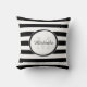 Um travesseiro decorativo quadrado preto-e-branco de rúgbi. Personalize este padrão de designer adicionando seu nome e monograma inicial. Este design de monograma da anca faz parte da Coleção de Cores de Verão de Decores de Bandas Black Stripes.