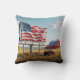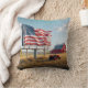 Um grande cartaz de bandeira norte-americano está em destaque em um campo de ouro, ao lado de um celeiro de fazenda vermelha e um trator, todos colocados contra um céu azul brilhante