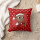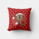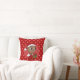 Um travesseiro decorativo com uma ilustração de um bebê afro-americano sorridente segurando um presente de Natal e vestindo um chapéu de Papai Noel; em um círculo vermelho sobre fundo vermelho, um design de Natal