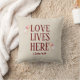 Travesseiro decorativo moderno, na moda BEIGE, projetado com LOVE LIVES AQUI em uma referência de tipografia burgundy e de Escritura PERSONALIZÁVEL que você pode personalizar adicionando seu nome (família). 1 John 4:16 diz "Deus é o amor, e aquele que se apaixona por Deus, e Deus nele." Esquema de cores NEUTRAL de BEIGE e BURGUNDY, com gráficos de coração duplo opcionais, que você pode excluir se desejar. Padrão geométrico em sentido inverso. Cobertura correspondente e outras cores disponíveis.