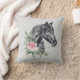 Travesseiro com uma bela ilustração de uma cabeça de cavalo preto com um rico de embelezamento floral ao lado do pescoço. Pintura de animais elegante e elegante.